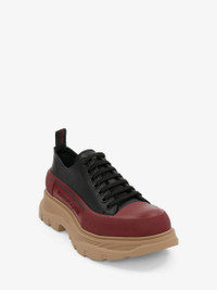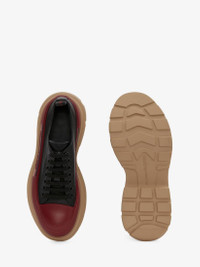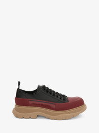 Black leather lace-up with an oversized cherry and beige rubber tread sole. The lace-up is detailed with a textured rubber wrap and tonal Alexander McQueen signature, finished with a signature ribbon on the heel of the shoe. Round toe shape silhouette detailed with rubber toe cap. Comes with two sets of black laces. Material:100% Calf leather Product Code:705662WHZ6H1541