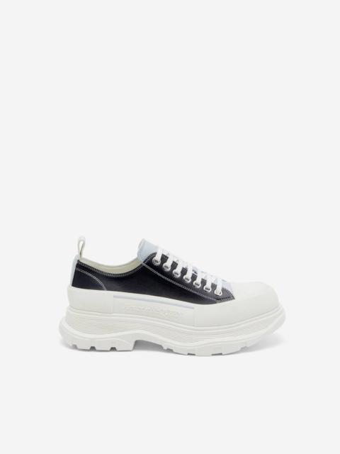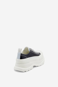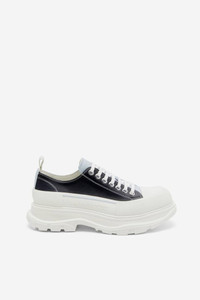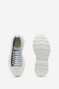 Navy and spring blue leather lace-up featuring an oversized rubber tread sole. The lace-up is detailed with a textured rubber wrap and tonal Alexander McQueen signature, finished with a signature ribbon on the heel of the shoe. Round toe shape silhouette detailed with rubber toe cap. Comes with two sets of white laces. Material:100% Calf Leather Product Code:705662WHZ6L4637