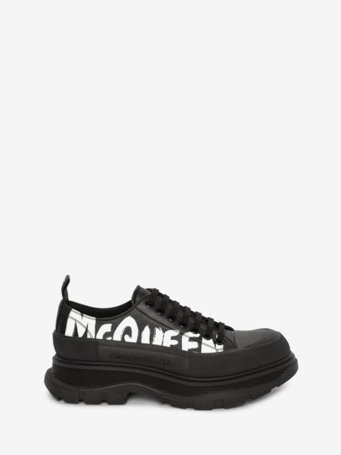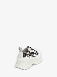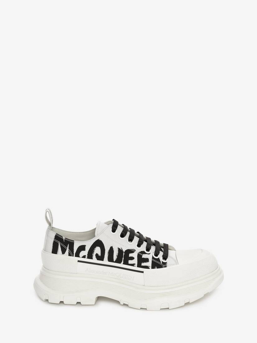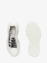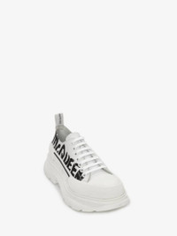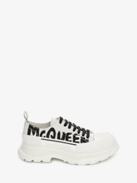 Optic white nappa lace-up with an oversized rubber tread sole featuring a printed McQueen Graffiti logo. The boot is detailed with a textured rubber wrap and tonal Alexander McQueen signature, finished with a signature ribbon on the back of boot. Round toe shape boot silhouette details rubber toe cap. Material:100% Calf Leather Product Code:711108WIAT69488