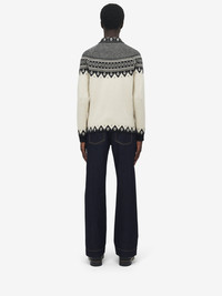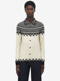 Polo cardigan in ecru and black wool. Point collar with silver metal stud embellishment and Fair Isle knit design with skull detailing. Finished with a front button fastening. Product details - Point collar - Front button fastening - Product code: 839662Q1BD49257 - Made in ITALY - Material: 100% Wool