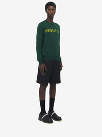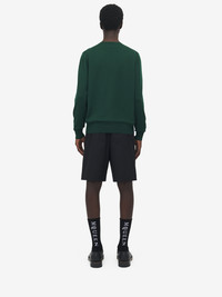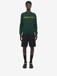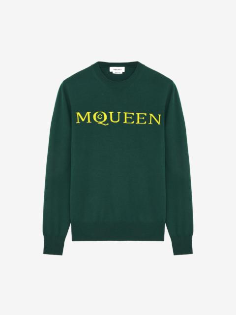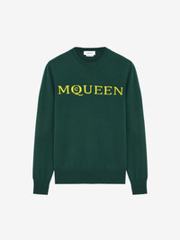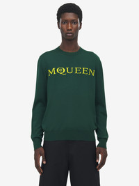 Crew neck jumper. Phthalo green fine merino wool with gold McQueen logo intarsia on the chest. Finished with tonal ribbed trims. Product details - Crew neck - Long sleeves - Ribbed trims - Product code: 839681Q1BEB3068 - Made in Italy - Material: 100% Wool