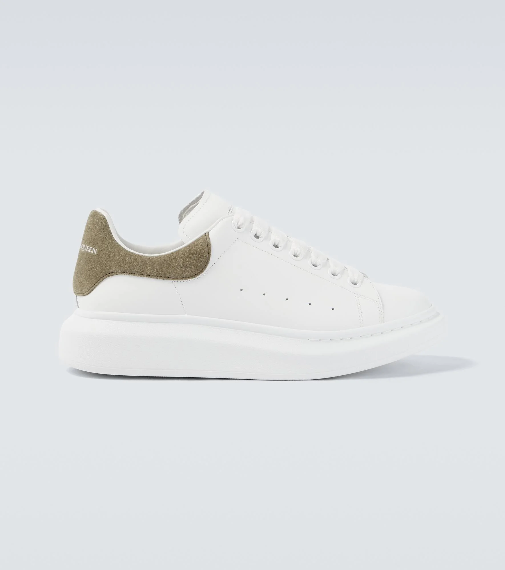 McQueen's low-top sneakers are crafted from leather with oversized rubber soles. An iconic style from the brand, this pair is finished with white laces and green suede heel counters. Product Details - Upper: calf leather - Lining: leather - Sole: leather insole, rubber sole - Toe shape: round toe - Made in Italy - Includes: extra laces, shoe box - Designer color name: White/Olive Green - Item color: white, green - Closure: lace-up - Item number: P01141132 Size & Fit - True to size - European sizes