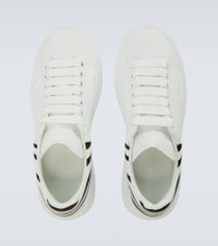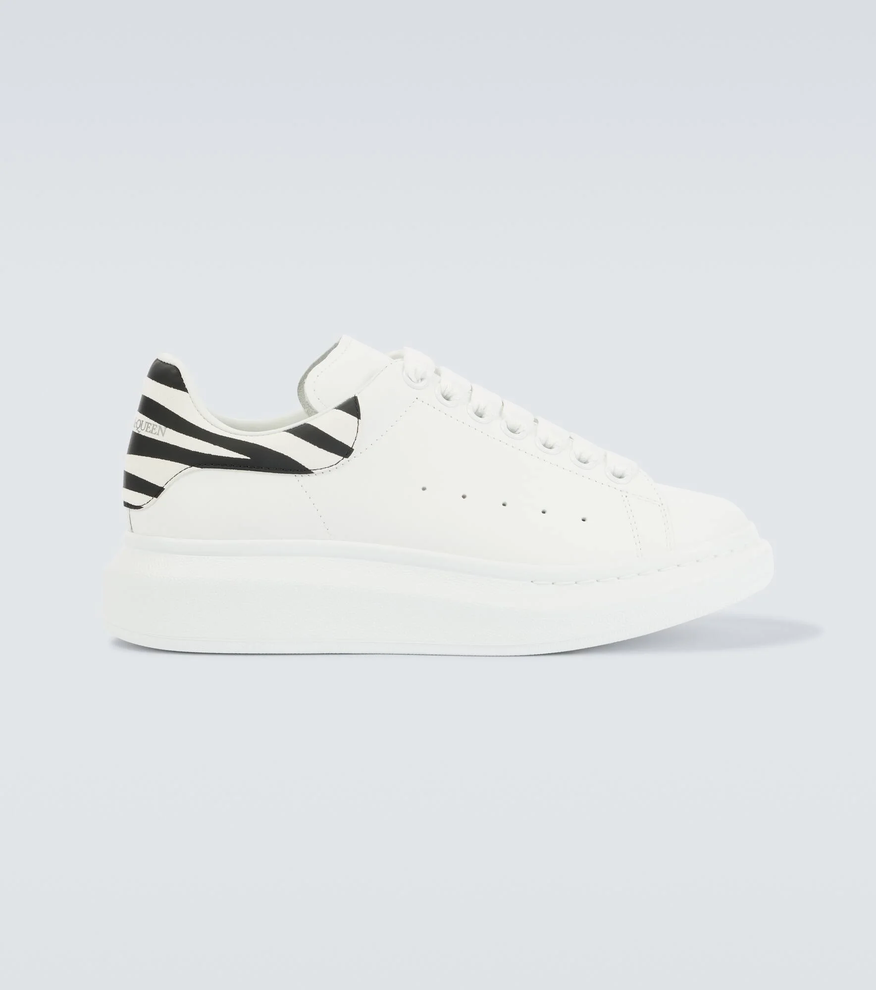 McQueen's low-top sneakers are crafted from leather with oversized rubber soles. An iconic style from the brand, this pair is finished with white laces and striped heel counters. Product Details - Upper: calf leather - Lining: leather - Sole: leather insole, rubber sole - Toe shape: round toe - Made in Italy - Includes: shoe box, extra laces - Designer color name: White/White Black - Item color: white - Closure: lace-up - Item number: P01110009 Size & Fit - True to size - European sizes