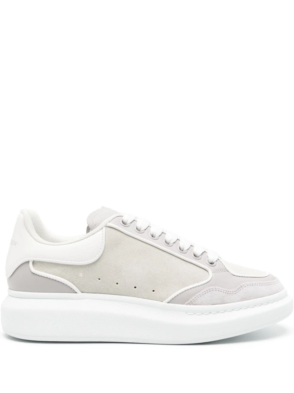 Oversized panelled sneakers Tying in with contemporary branding trends, this pair of lace-up sneakers from Alexander McQueen feature logo-print detailing at the tongue and heel counter of the design. Highlights - Grey/multicolour - Calf leather - Colour-block panelled design - Suede panelling - Logo-debossed tongue - Contrasting branded heel counter - Perforated detailing - Round toe - Front lace-up fastening - Branded insole - Flatform sole Made in Italy Composition Outer: Calf Leather 100% Sole: Rubber 100% Lining: Calf Leather 100% SIZE & FIT Measurement HEEL 1.96 in(5 cm) Sole height 1.37 in(3.5 cm)