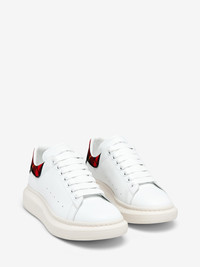The Oversized Sneaker – statement silhouette in white calf leather with a red tartan heel counter. Finished with a chunky rubber sole. Product details - Round toe - McQueen signature - Contrasting heel counter - Oversized rubber sole - Additional pair of shoelaces included - Product code: 553680WIAJQ9202 - Made in ITALY - Material: Calf Leather
