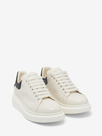The Oversized Sneaker - Statement silhouette in off white and black grainy leather, with heel counter debossed with the McQueen logo. Finished with a chunky rubber sole. Product details - Round toe - Alexander McQueen logo - Contrasting heel counter - Oversized rubber sole - Additional pair of shoelaces included - Product code: 807881WHADP9062 - Made in Italy - Material: 100% Shearling