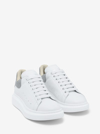 The Oversized Sneaker - Statement silhouette in off white leather and light grey suede, with heel counter debossed with the McQueen logo. Finished with a chunky rubber sole. Product details - Round toe - Alexander McQueen logo - Contrasting heel counter - Oversized rubber sole - Additional pair of shoelaces included - Product code: 705060WIAEI9164 - Made in Italy - Material: 100% Calf Leather