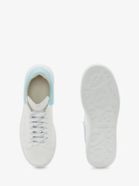 White smooth calf leather lace-up sneaker trimmed with a transparent paradise blue rubber heel counter. The sneaker features large white flat laces and an oversized rubber sole. Finished with an Alexander McQueen signature on tongue and heel counter. Oversized rubber sole with signature stamp design. The sneakers come with an additional lace set. To lessen our environmental impact and to reduce cotton consumption, we will no longer be providing a dust bag with our sneakers. Material: 100% Calf Leather