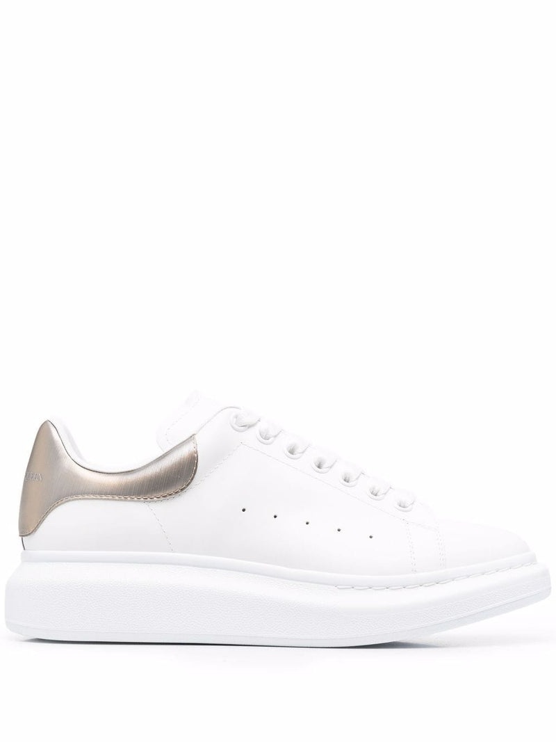 ALEXANDER MCQUEEN Oversized low-top leather sneakers The Oversized sneakers by Alexander McQueen get their name from the voluminous rubber sole they sit upon. A leather construction gives the casual pair a refined finish, completed by the silver-tone heel counter printed with the brand's logo. Highlights - white/silver - leather - logo-print tongue - contrasting branded heel counter - round toe - front lace-up fastening - chunky sole Made in Italy Composition Outer: Calf Leather 100% Brand style ID: 586204WIBNR