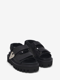 The Parachute Sandal – black smooth calf leather with a round toe silhouette and a triple strap construction. Detailed with metal pin arrow hardware engraved with the McQueen logo and a chunky lug sole. Product details - Round toe - Chunky lug sole - Sole height: 50mm / 1.9 inches including footbed - Product code: 815896WIACT1064 - Made in Italy - Material: Calf Leather