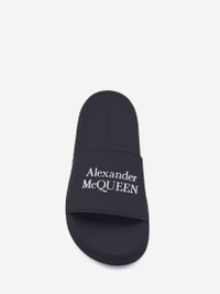 Navy rubber slide with a contrasting embedded Alexander McQueen signature on the strap. The slide has a black textured oversized rubber sole. Finished with a round toe silhouette. Material: 100% Rubber