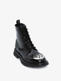Black leather lace-up boot embellished with a studded silver-finished toe cap. Boot silhouette with a round toe shape and a rubber sole. Finished with an Alexander McQueen signature in contrast on the back tabs. Product Details: - Chrome free leather upper / chrome free lining Material:100% Calf Leather Product Code:705080WIC631081
