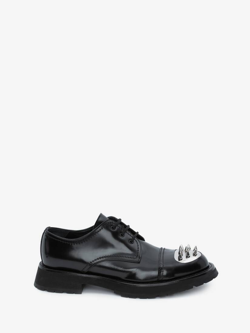 Black leather Derby lace-up embellished with a studded silver-finished toe cap. Round toe shape and a rubber sole. Product Details: - Chrome free leather upper / chrome free lining Material:100% Calf Leather Product Code:705083WIC631081
