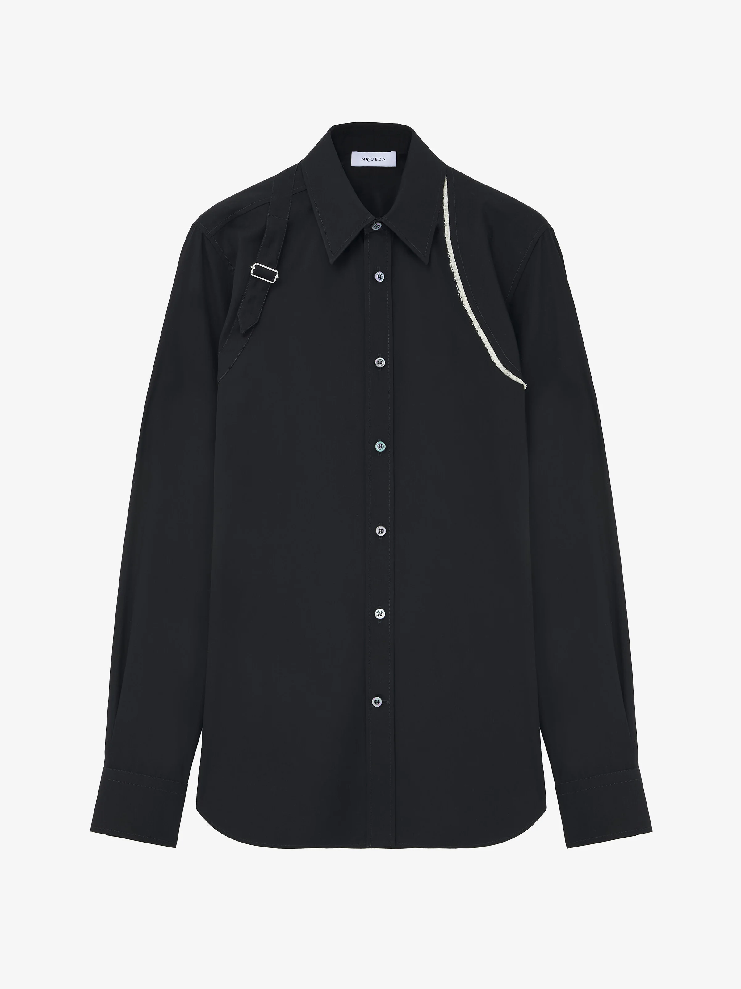 Shirt in black cotton poplin. Point collar and tonal harness with contrast raw edge canvas detailing. Finished with a front button fastening. Product details - Point collar - Front button fastening - Made with organic cotton yarn - Product code: 838526QNAAX1000 - Made in Romania - Material: 100% Cotton