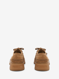 The Rover Shoe – tan suede with a soft round toe silhouette. Tonal laces with skull charm hanging from the right shoe. Finished with a chunky lug sole and the embossed McQueen logo on the back. Product details - Round toe - Chunky lug sole - Sole height: 50mm / 1.9 inches - Product code: 848697WHAE42366 - Made in ITALY - Material: Calf Leather