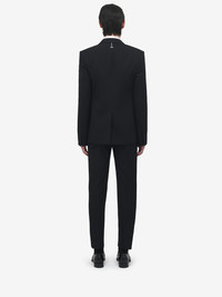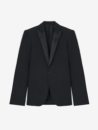 Single-breasted tuxedo jacket. Black Japanese wool barathea with a jet stone Sailor Tattoo Rose embroidery and tonal satin detailing. Peak lapels, chest pocket and side jetted pockets. Finished with a T-bar chain back detail. Product details - Peak lapels - Side jetted pockets - Single button fastening - Product code: 838579QVAAA1000 - Made in Italy - Material: 100% Wool