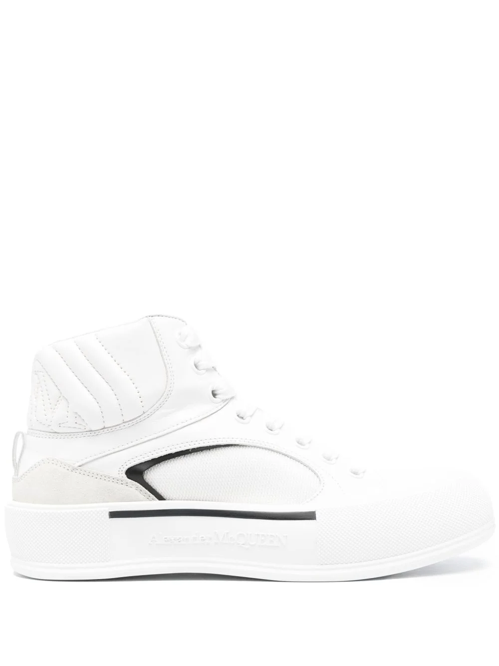 Seal-embroidered sneakers Highlights - White/black - Calf leather - Front lace-up fastening - Panelled design - Suede panelling - Pull-tab at the heel - Signature seal logo - Embroidered logo to the rear - Mesh panelling - Logo at the sole - Logo-embossed tongue - Embossed logo to the side - Round toe - Leather lining - Branded insole - Chunky rubber sole - To lessen the environmental impact and to reduce cotton consumption, alexander mcqueen will no longer be providing a dust bag with its sneakers. Made in Italy Composition Outer: Fabric 100%, Calf Leather 100%, Calf Suede 100% Lining: Calf Leather 100%, Fabric 100% Sole: Rubber 100% SIZE & FIT Measurement HEEL 1.57 in(4 cm) HEIGHT 3.93 in(10 cm) PLATFORM 1.57 in(4 cm)
