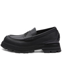 Alexander McQueen showcases its audacious creativity and masterful craftsmanship in the Wander Loafer. It's a fresh twist on a timeless style, made from smooth leather with cutaway branding creating a distinctive penny slot. What really sets it apart? A thick, cleated rubber sole that even curves up to the toe and side. - Leather Upper - Cut-Away Branded Penny Slot - Rubber Sole - Made in Italy