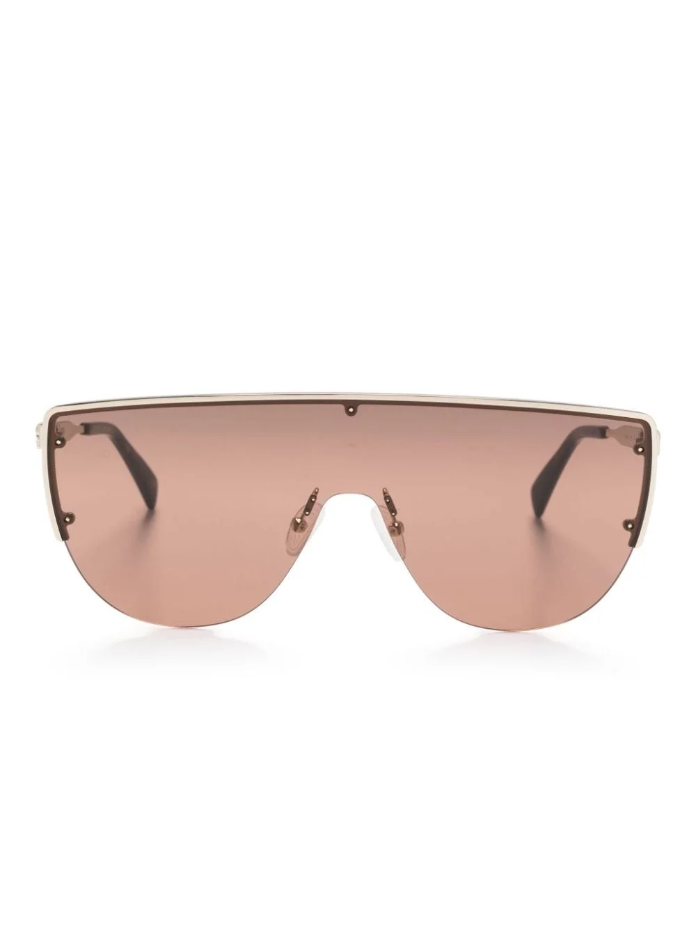 skull-stud shield-frame sunglasses Highlights - Gold-tone - Metal/acetate - Shield frame - Brown tinted lenses - Wide bridge - Nose pads - Logo-engraved arm - Small skull stud detail at the arms - Tortoiseshell-effect curved tips - These glasses come with a protective case. Imported Composition Metal 100%, Acetate 100% SIZE & FIT Measurement Arm Length 5.7 in(14.5 cm) Bridge Width 0.03 in(0.1 cm) Lens Diameter 3.89 in(9.9 cm) Total Width 5.51 in(14 cm)