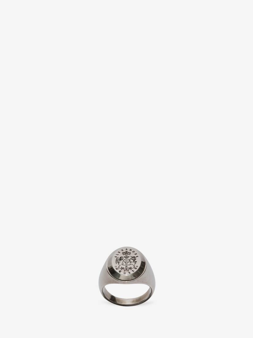 Signet ring in brass with an antique silver finish. Engraved coat of arms motif with an Alexander McQueen signature. Material:100% Brass Product Code:554494J160Y0446