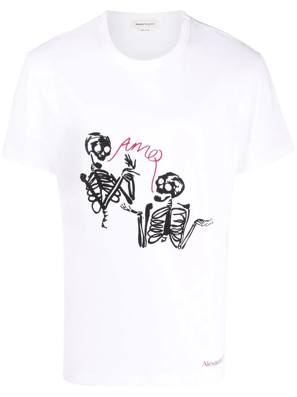 skeleton logo-print T-shirt white cotton skeleton print logo print to the front logo print to the side round neck short sleeves straight hem Made in Italy Composition Cotton 100% SIZE & FIT Model measurements Height 6 ft 2 in(1.89 m) Bust/Chest 35.43 in(90 cm) Hips 36.61 in(93 cm) Waist 28.74 in(73 cm) FittingInformation This piece fits true to size. We recommend you get your regular size Cut for a relaxed fit Made with a mid-weight fabric Washing instructions Hand Wash