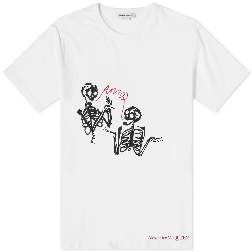 Alexander McQueen and skeletons have long been a match made in heaven, and that’s why they’re printed at the front of this white tee having a friendly chat. It’s made in Italy using premium cotton jersey and features the brand’s logo along the hemline. - 100% Cotton - Ribbed Crewneck - Printed Branding - Made in Italy