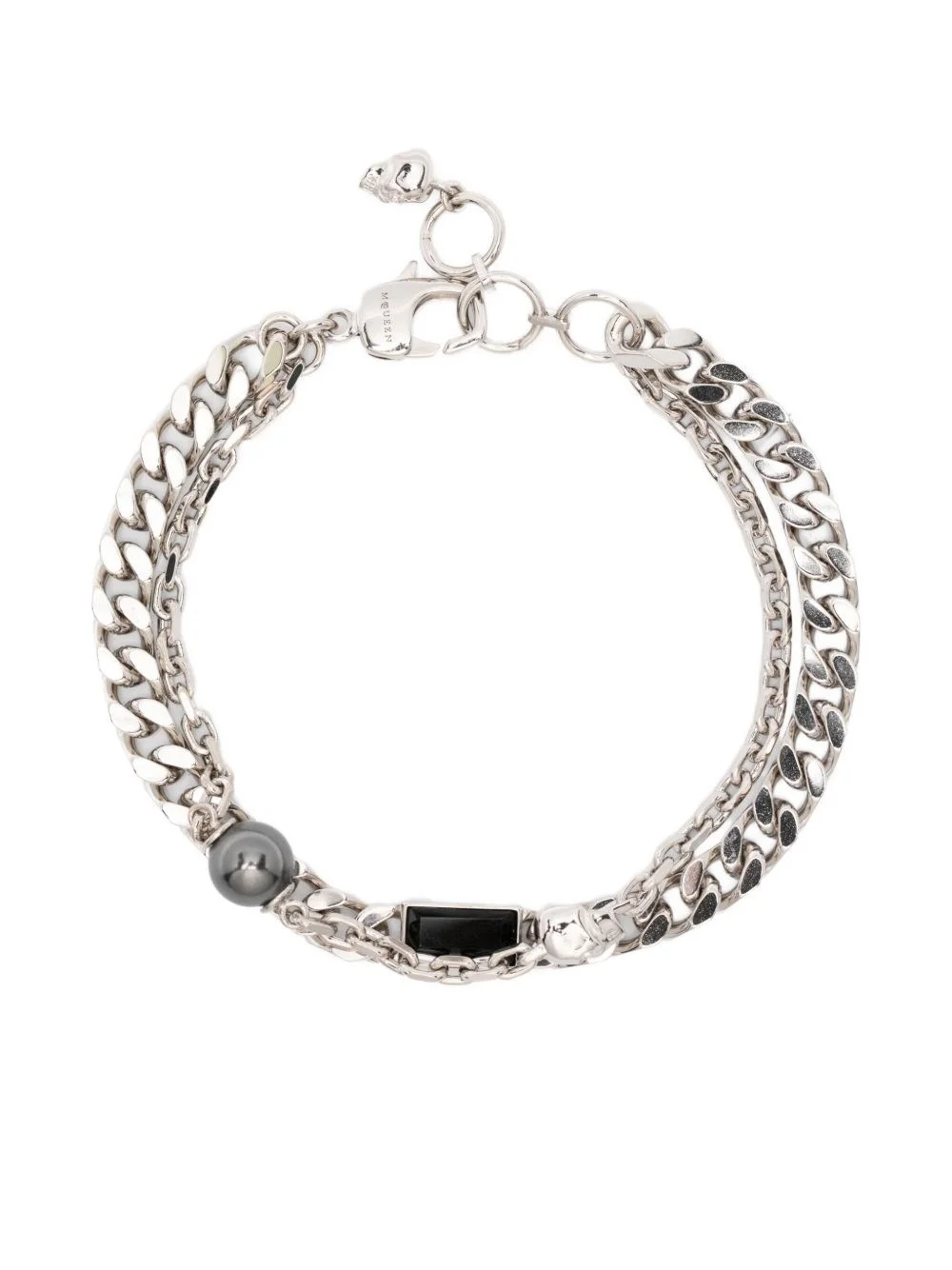 Silver chain bracelet with pearl and contrasting stone and Skull pendant. Carabiner closure. product code: 846584J161E1212 COMPOSITION Made in Italy 100% metal