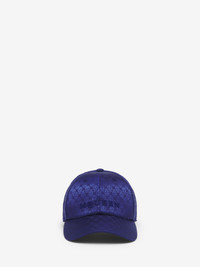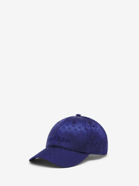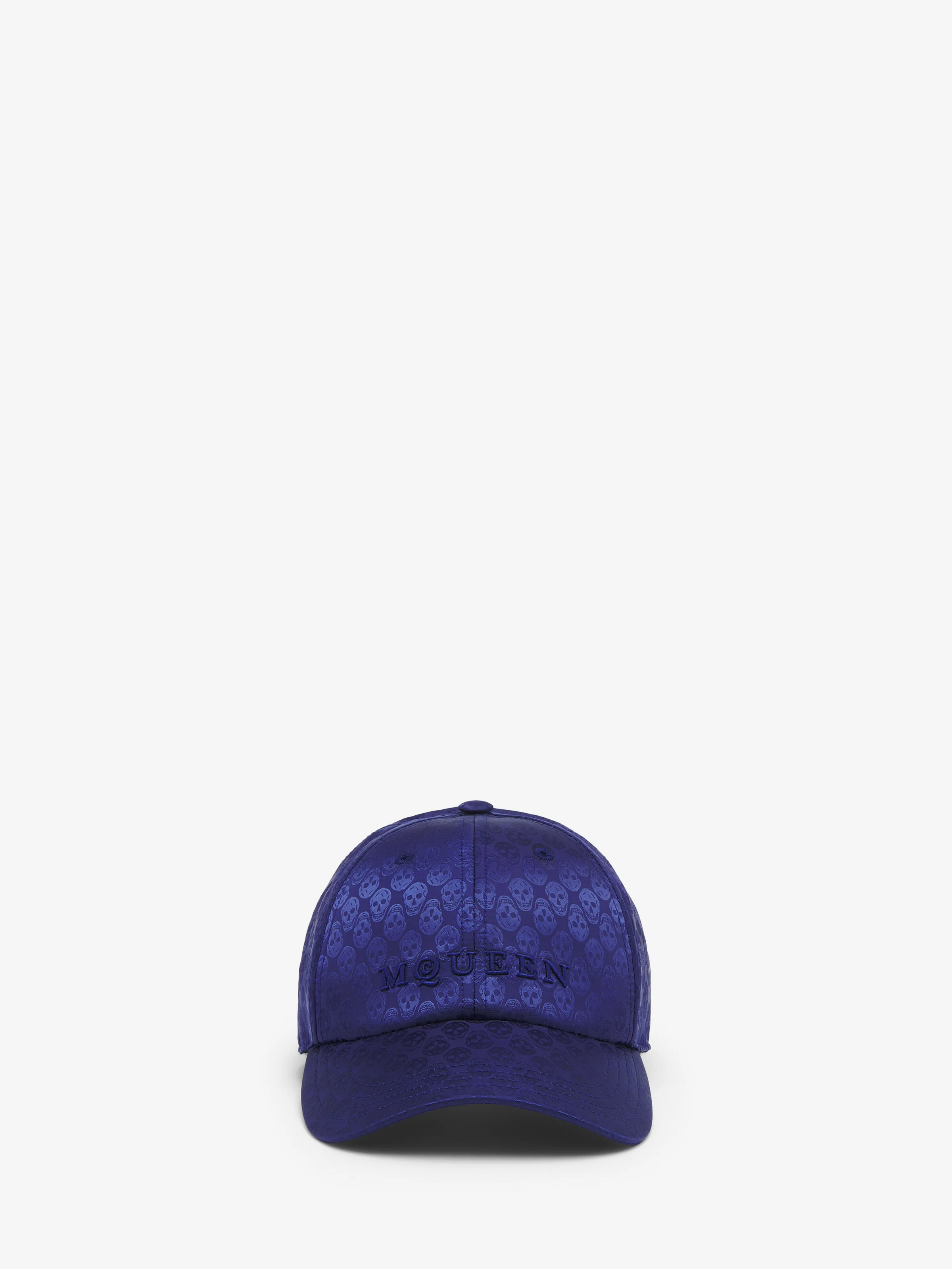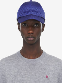 Navy nylon baseball cap featuring a skull repeat jacquard and a McQueen logo embroidery on the front. The cap is finished with an adjustable leather closure at the back. Product details - Sizes: S to XL - Product code: 8386324419Q4100 - Made in Italy - Material: Polyamid