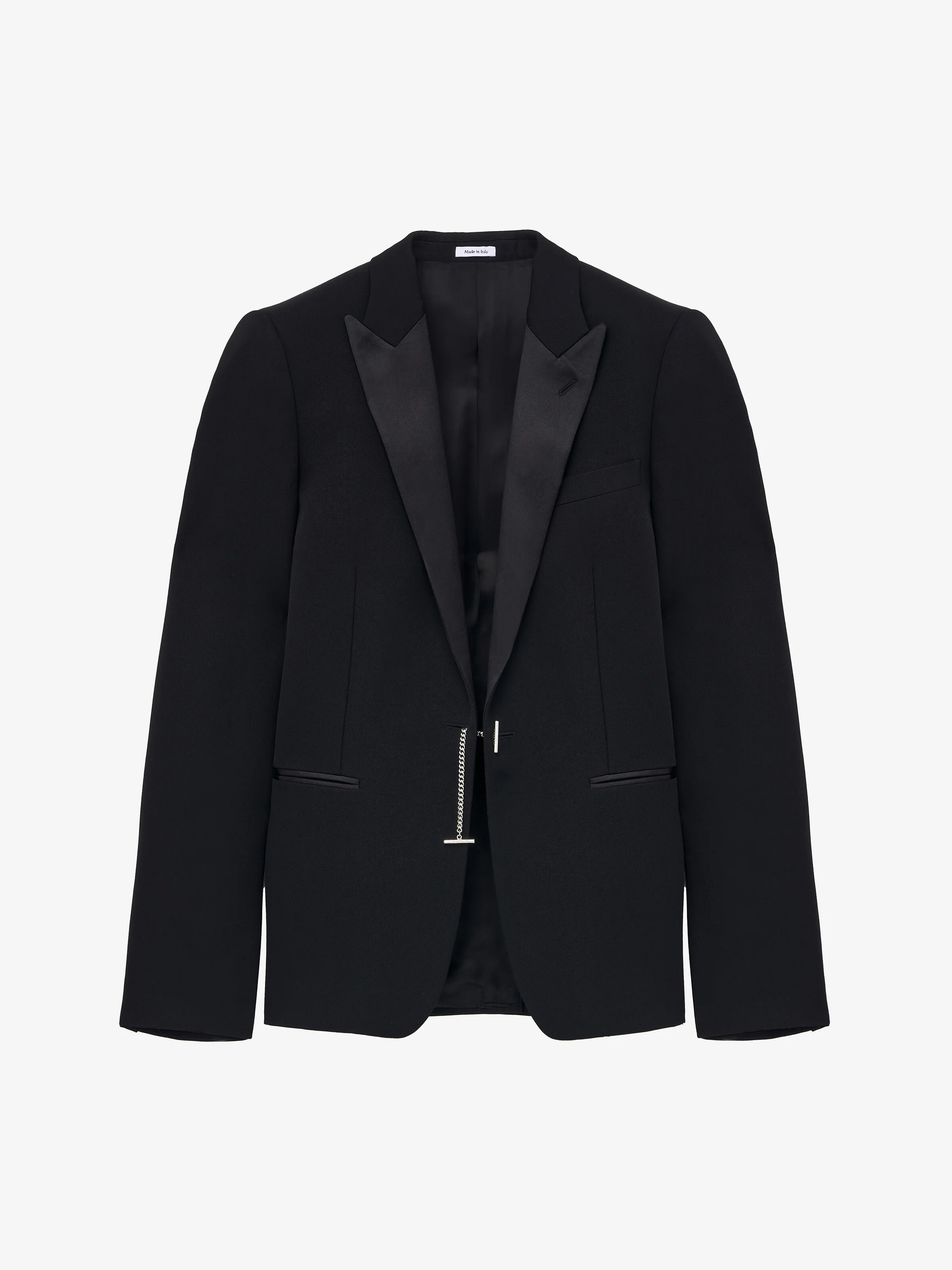 Single-breasted jacket in black wool barathea. Peak lapels, chest pocket and two jet pockets. Finished with a T-bar chain front closure. Complete the look with the matching trousers. Product details - Peak lapels - Side flap pockets - Single button fastening - Made with certified wool yarn - Product code: 822415QVAAA1000 - Made in Italy - Material: Wool