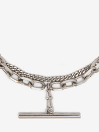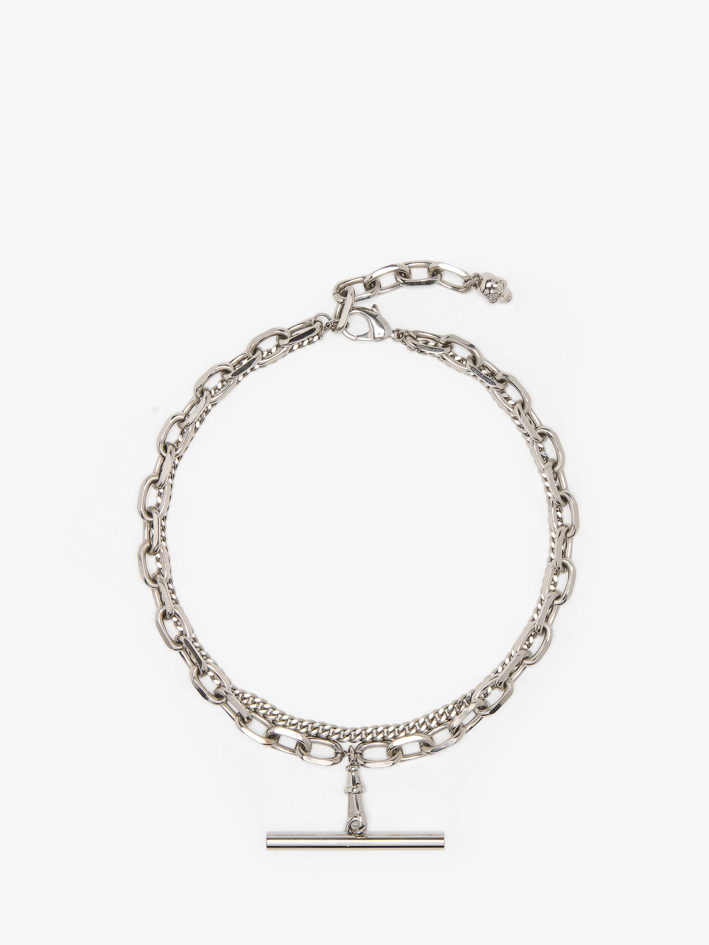 Palladium-finished double-chain necklace featuring a metal bar with the engraved McQueen logo. Lobster clasp closure with skull charm. Adjustable length. Eco-brass hardware. Product details - Eco brass hardware - Palladium finish - Lobster clasp closure - Total length when closed at first link: 42cm - Product code: 804724J160N0926 - Made in Italy - Material: Brass
