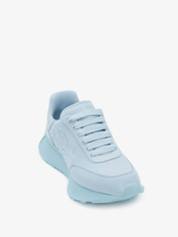 Sprint Runner with a pieced and patched upper silhouette in spring blue metal free leather featuring an embossed Seal logo on the side and an Alexander McQueen signature on the heel counter. The sneaker features an oversized runner sole, large flat laces, a padded heel counter and tongue with an Alexander McQueen signature. Comes with an additional set of spring blue laces. Material: 100% Lambskin Metal Free Leather