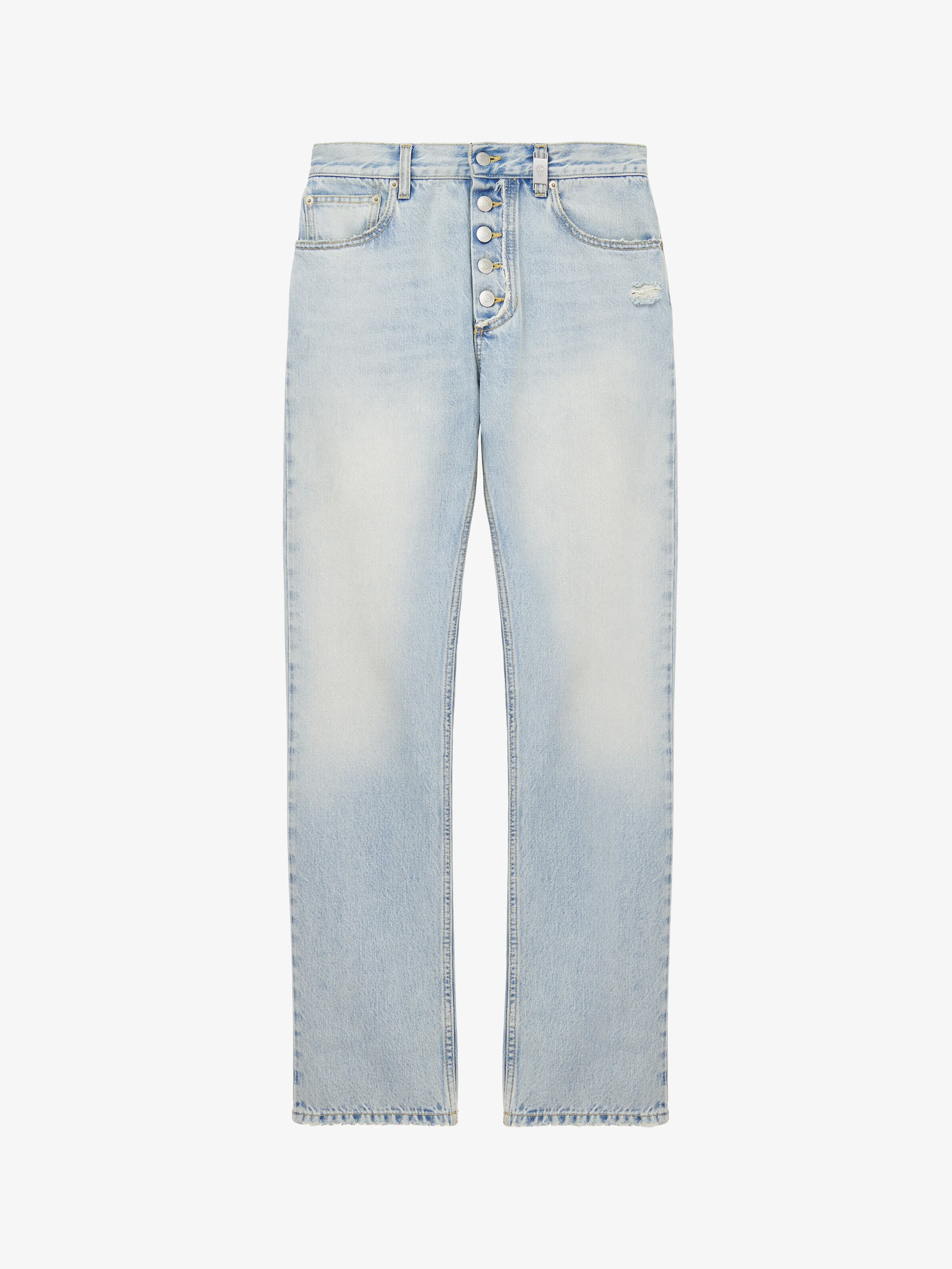 Slim fit jeans in blue washed denim. Five pocket design and belt loops with metal skull plaque. Finished with an exposed front button fastening. Product details - Belt loops - Front button fastening - Product code: 820879QYABN4211 - Made in Italy - Material: 100% Cotton