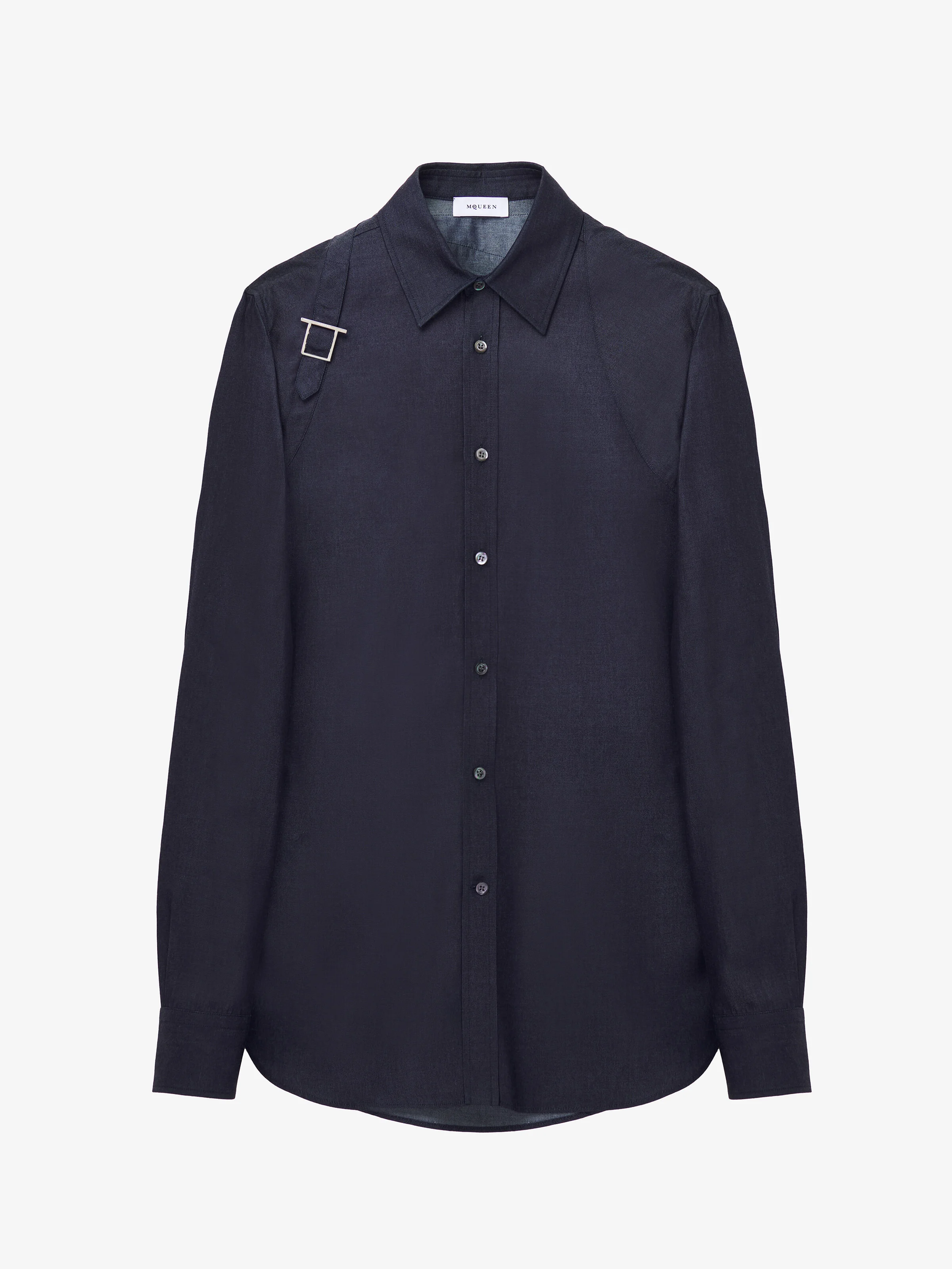 Point collar shirt in indigo lightweight denim shirting with tonal harness. Metal buckle with T-Bar detailing engraved with the McQueen logo. Finished with a front button fastening. Product details - Point collar - Front button fastening - Product code: 828635QYABM4244 - Made in Italy - Material: 61% Cotton, 39% Lyocell