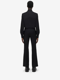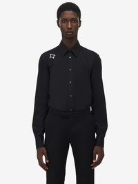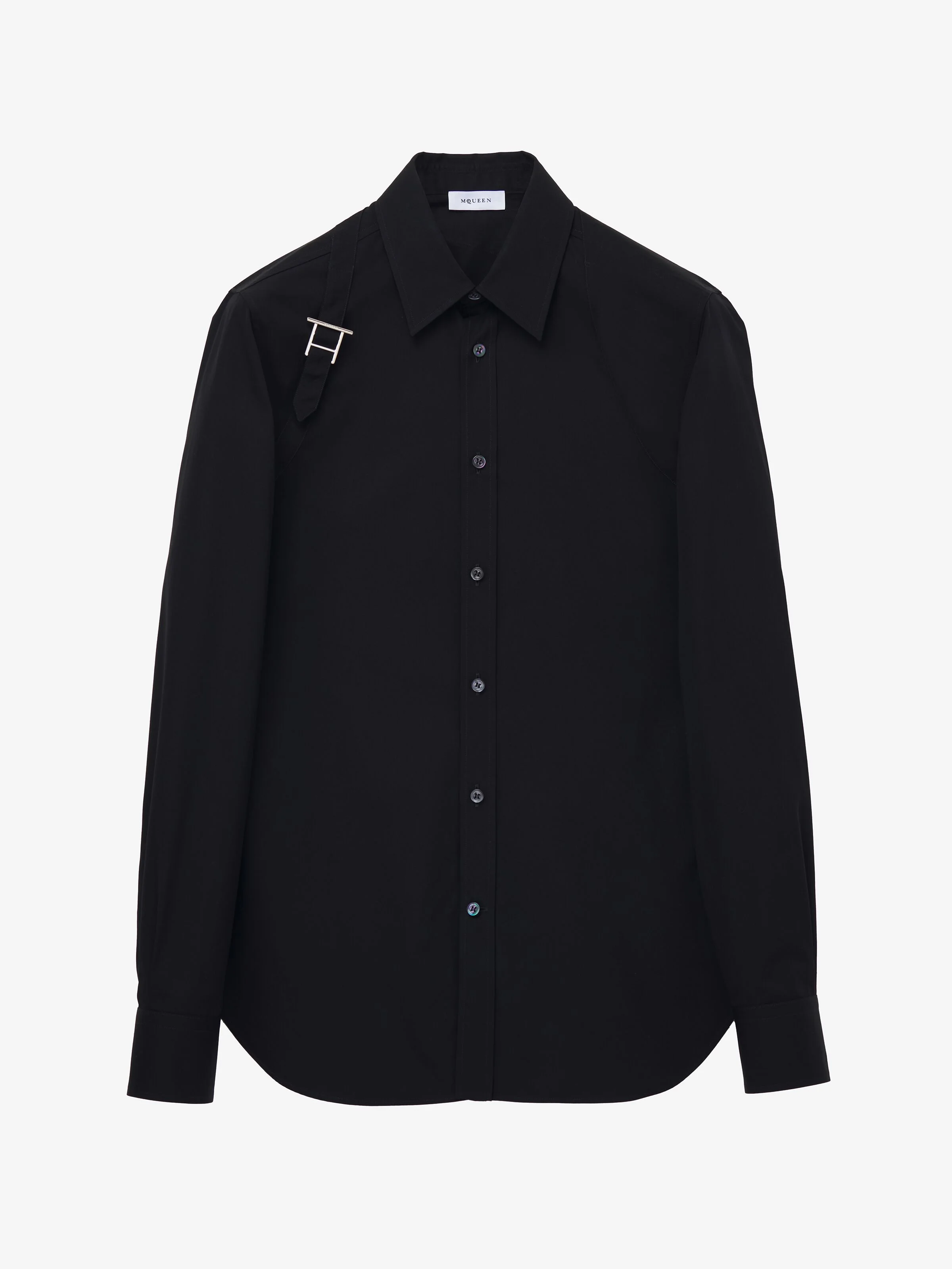 Point collar shirt in black cotton poplin with tonal harness. Metal buckle with T-Bar detailing engraved with the McQueen logo. Finished with a front button fastening. Product details - Point collar - Front button fastening - Made wirh organic cotton yarn - Product code: 828259QNAAX1000 - Made in Romania - Material: 100% Cotton