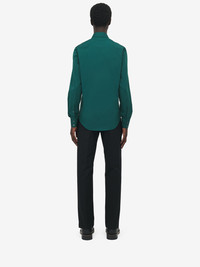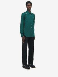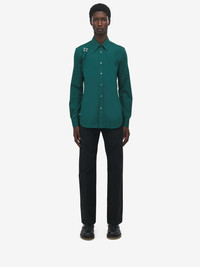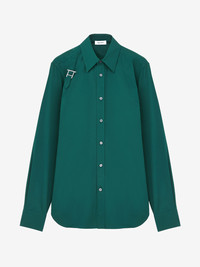 Shirt in phthalo green cotton poplin. Point collar, harness with T-bar buckle detailing and curved hem. Finished with a front button fastening. Product details - Point collar - Front button fastening - Made with organic cotton yarn - Product code: 828259QNAAX3057 - Made in Romania - Material: 100% Cotton