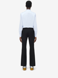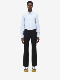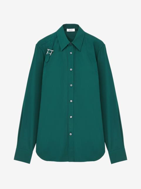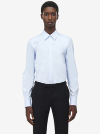 Point collar shirt in shirting blue cotton poplin with tonal harness. Metal buckle with T-Bar detailing engraved with the McQueen logo. Finished with a front button fastening. Product details - Point collar - Front button fastening - Made wirh organic cotton yarn - Product code: 828259QNAAX4331 - Made in Romania - Material: 100% Cotton