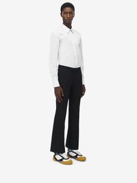 Point collar shirt in optical white cotton poplin with tonal harness. Metal buckle with T-Bar detailing engraved with the McQueen logo. Finished with a front button fastening. Product details - Point collar - Front button fastening - Made wirh organic cotton yarn - Product code: 828259QNAAX9000 - Made in Romania - Material: 100% Cotton