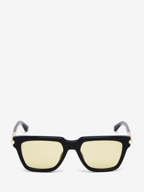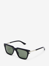 Black acetate sunglasses fitted with solid smoke lenses. The sunglasses have a square shape a statement T-Bar on the sides as endpiece. The silver T-Bar element is integrated on the temples and it is finished with the lasered McQueen logo. All McQueen Eyewear is 100% certified UV protective (UVA and UVB rays). Product details - The Eastman Acetate Renew used in this style includes 27% recycled material achieved via mass balance approach. - The style can be fitted with prescription lenses. - Product code: 841552J07491055 - Made in JAPAN - Material: Recycle Acetate & Bio Nylon Lens