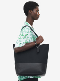 The T-Bar Shopper—crafted from black drill canvas with a coated bottom. Statement T-Bar buckle in silver metal engraved with the McQueen logo. The bag can be carried on the shoulder using the leather handles. Product details - Dimensions: Length 34 x Height 41 x Depth 17 cm / 13.3 x 16.1 x 6.6 inches - Silver tone metal T-Bar buckle - Handle drop: 27 cm / 10.6 inches - T-Bar length: 6 cm / 2.3 inches - McQueen lettering on the front - One central compartment - Internal pocket - Internal card slot - Metal D-ring - Canvas lining - Product code: 8360691AAU21000 - Made in Italy - Material: 98% Cotton, 2% Polyurethane