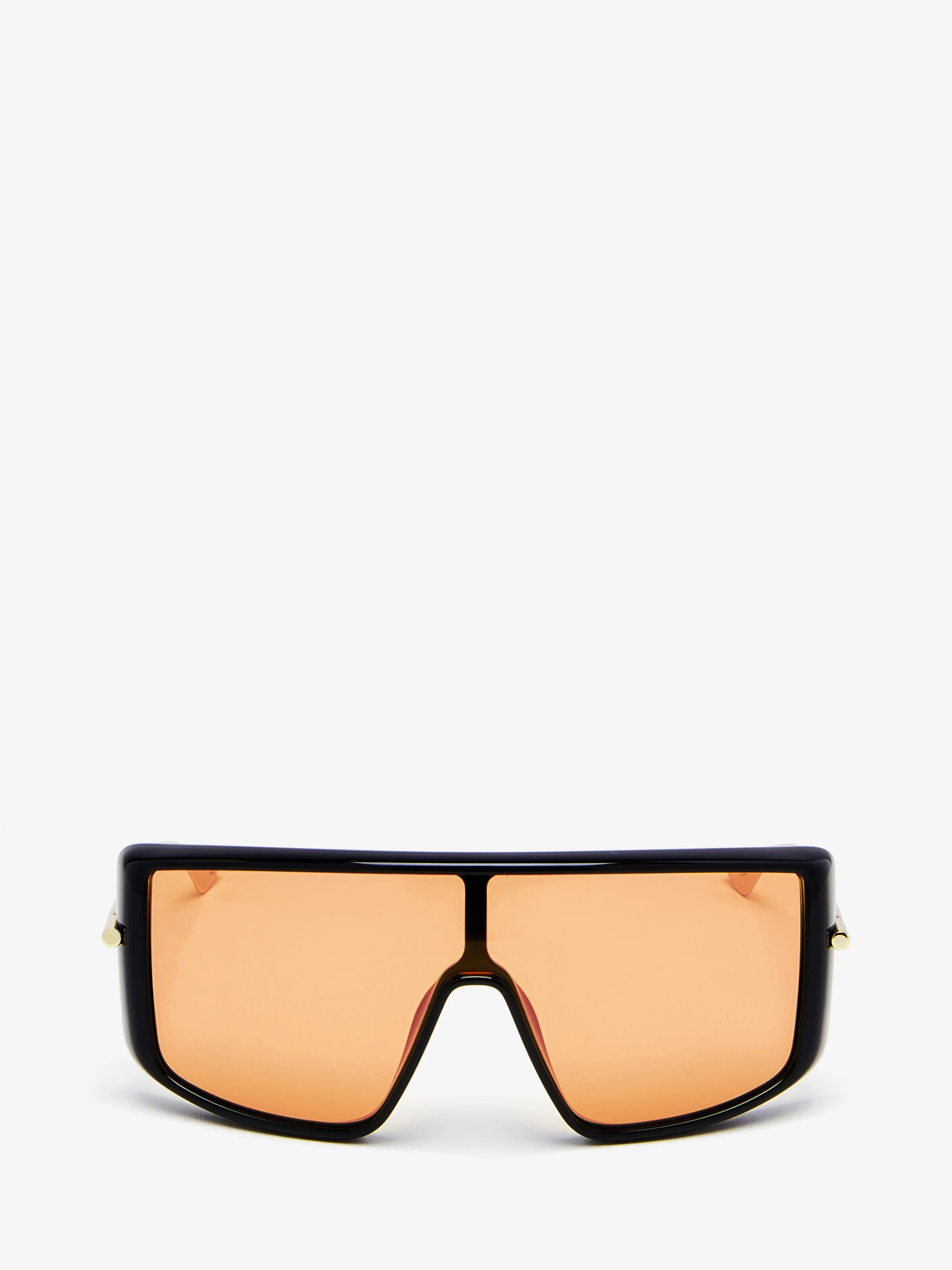 Black acetate sunglasses fitted with solid orange lens and with light gold tone metal temples. The sunglasses have an oversize visor shape and feature T-Bar detailing interpreted as a temple and finished with the lasered McQueen logo. All Alexander McQueen Eyewear is 100% certified UV protective (UVA and UVB rays). Product details - Product code: 852607J07701155 - Made in JAPAN - Material: Metal