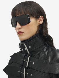 Black acetate sunglasses fitted with solid smoke lens and with silver metal tone temples . The sunglasses have an oversize visor shape and feature T-Bar detailing interpreted as a temple and finished with the lasered McQueen logo. All Alexander McQueen Eyewear is 100% certified UV protective (UVA and UVB rays). Product details - Product code: 852607J07701055 - Made in JAPAN - Material: Metal
