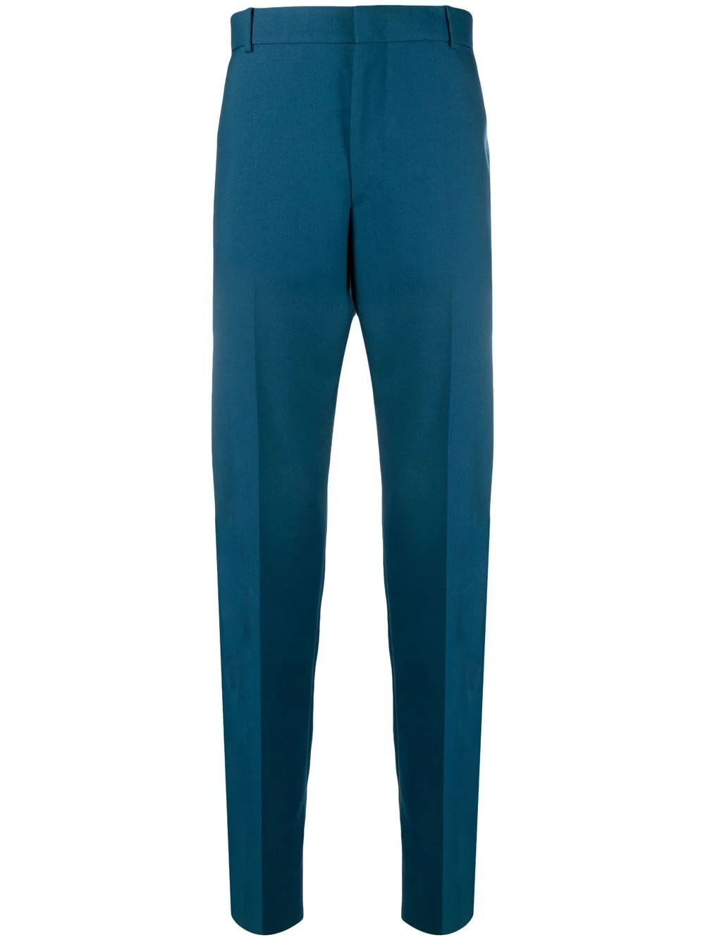 tailored tapered-leg trousers teal blue wool blend tailored cut tapered leg concealed front fastening belt loops two diagonal pockets to the sides two rear button-fastening jetted pockets Made in Italy Composition Lining: Cupro 100%, Cotton 100% Outer: Wool 50%, Polyester 50% SIZE & FIT Model measurements Height 6 ft 2 in(1.87 m) Bust/Chest 35.82 in(91 cm) Hips 35.43 in(90 cm) Waist 27.95 in(71 cm) FittingInformation This piece fits true to size. We recommend you get your regular size Cut for a slim fit Made with a mid-weight non-stretch fabric Washing instructions Dry Clean Only
