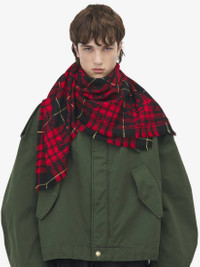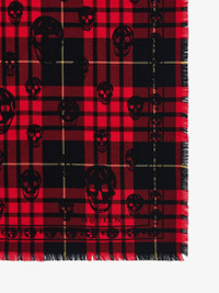 Tartan jacquard foulard in red and black wool featuring a skull overprint. The foulard is finished with a skull border and the McQueen logo. Product details - Dimensions: 104x120cm / 4 x 4.7 inches - Product code: 4294124200Q6460 - Made in Italy