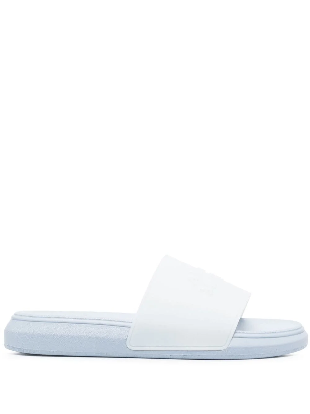 single-strap flat slides light blue branded insole open toe single toe strap flat rubber sole Made in Italy Composition Outer: Rubber 100% Sole: Rubber 100% Lining: Rubber 100% SIZE & FIT Measurement HEEL 1.37 in(3.5 cm) Sole height 0.78 in(2 cm)