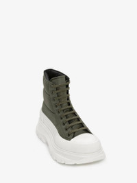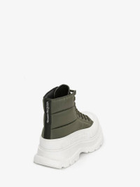 Khaki lace-up boot in stitched polyfaille puffer panelling with a thick oversized rubber tread sole. The boot is detailed with a textured rubber wrap and tonal Alexander McQueen signature, finished with a signature ribbon on the back of boot. Round toe shape boot silhouette details rubber toe cap. Material: 100% Polyester
