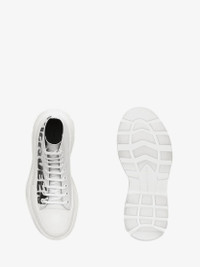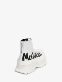 Optic white nappa lace-up boot with an oversized rubber tread sole featuring a printed McQueen Graffiti logo. The boot is detailed with a textured rubber wrap and tonal Alexander McQueen signature, finished with a signature ribbon on the back of boot. Round toe shape boot silhouette details rubber toe cap. Material:100% Calf Leather Product Code:682422WIABD9488