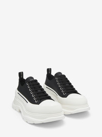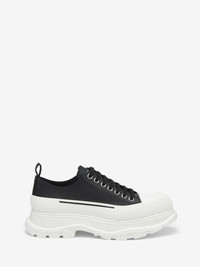 The Tread Slick Lace-Up—black canvas lace-up with a round toe silhouette and a thick oversized rubber tread sole in white. Detailed with a textured rubber wrap and tonal McQueen signature. Product details - Lace-up closure - Round toe - Padded ankle - Chunky lug sole - Sole height: 50 mm / 2.7 inches - Product code: 842493WIAGY1021 - Made in Italy - Material: Calf Leather