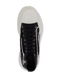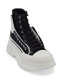 Tread Slick lace-up fastening boots from Alexander McQueen featuring eyelet detailing, pull-tab at the heel, front lace-up fastening, branded insole, chunky rubber sole, jet black, ankle length and round toe. Fabric and Care Designer Style ID: 735819W4TGR Designer Colour: 1170 - BLKWHIOFWHBLKSI Composition: Sole: Rubber 100%; Outer: Fabric 100%; Lining: Fabric 100%Made in Italy