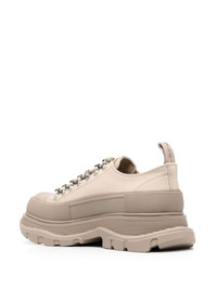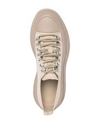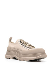 Tread Slick lace-up sneakers Tread Slick lace-up sneakers from Alexander McQueen featuring light beige, sesame beige, calf leather, embossed logo to the side, silver-tone hardware, logo pull-tab at the heel, round toe, rubber toecap, branded insole and chunky rubber sole. Made in Italy Composition Outer: Fabric 100% Lining: Calf Leather 100% Sole: Rubber 100% SIZE & FIT Measurement HEEL 1.8 in(4.5 cm) Sole height 1 in(2.5 cm)