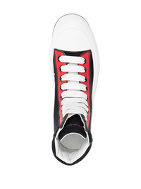 Tread Slick lace-up sneakers Alexander McQueen’s bold approach to design is evident on these high-top sneakers. Imagined in black with vibrant red leather panels, this pair rests on a contrasting white rubber sole. Highlights - Black/red - Calf leather - Colour-block panelled design - Front lace-up fastening - Round toe - Eyelet detailing - Branded heel counter - Contrasting rubber sole Made in Italy Composition Outer: Calf Leather 100%, Fabric 100% Lining: Calf Leather 100% Sole: Rubber 100% SIZE & FIT Measurement HEEL 1.57 in(4 cm) Sole height 1.57 in(4 cm)